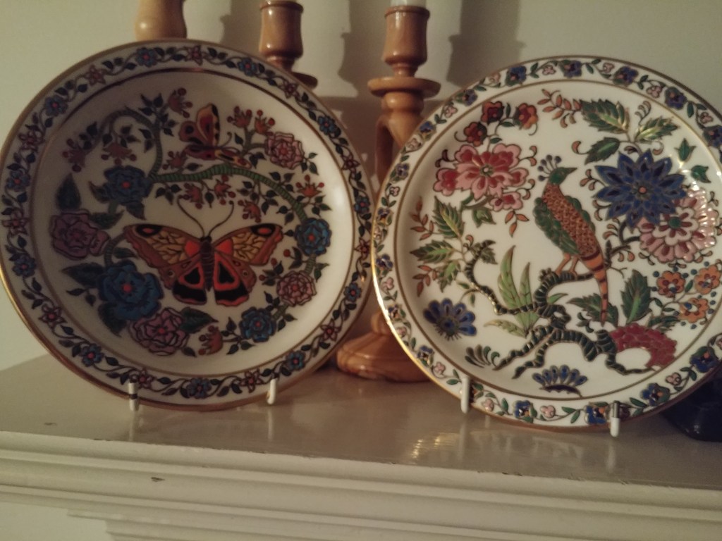 I came across two decorative plates on the shelves in her dining room, displayed on little stands \ made for the purpose. Colorful pictures of flowers and vines and greenery covered them with a little pattern of smaller dainty blossoms around the edges. There was a butterfly featured on one and something like a peacock on the other. And everything was outlined with this lovely gold filament.