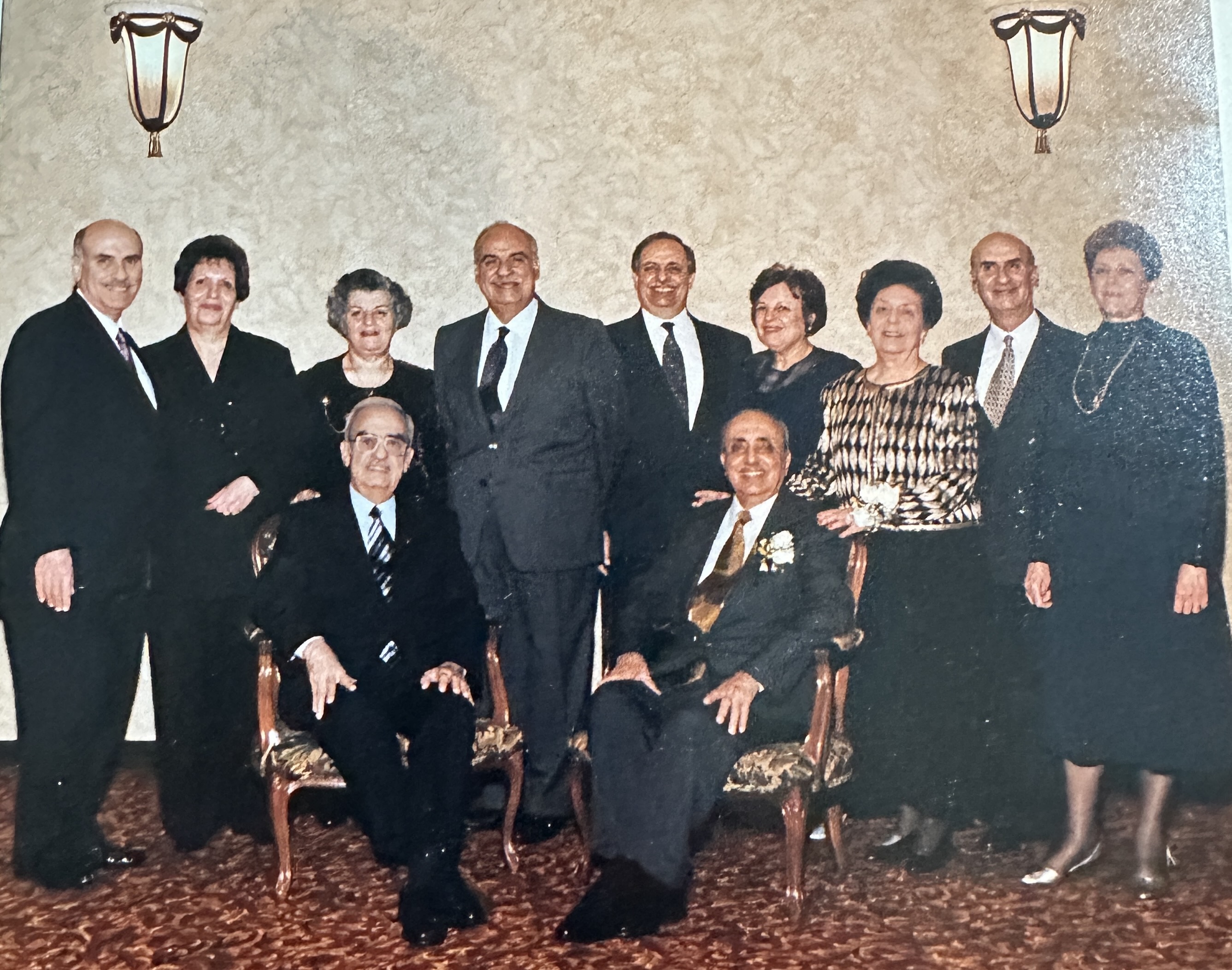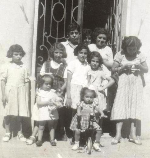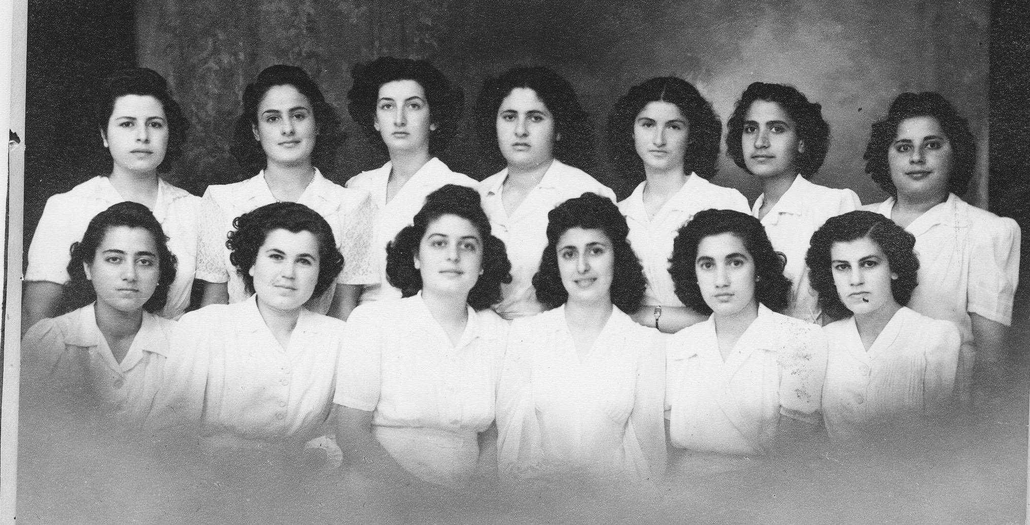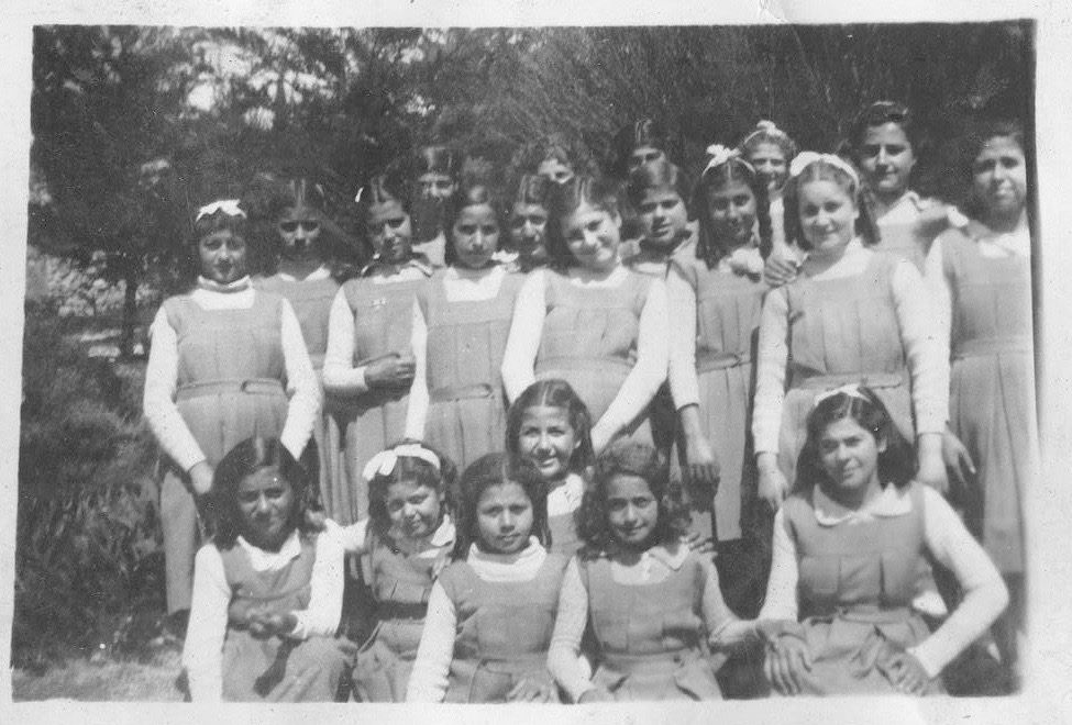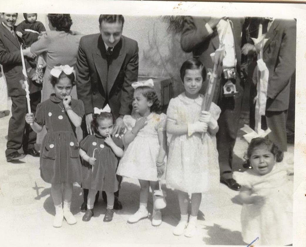Bahi & Fariid with Fariid’s five brothers and their wives (Labiib is standing, fourth from left) on the occasion of their 50th wedding anniversary; Aniiseh & Wadii’ and their daughters (at the time); Bahi and baby May; Bahi photographed in her engagement dress; Bahi (seated third from left) and her graduating class at the Ramallah Friends School
