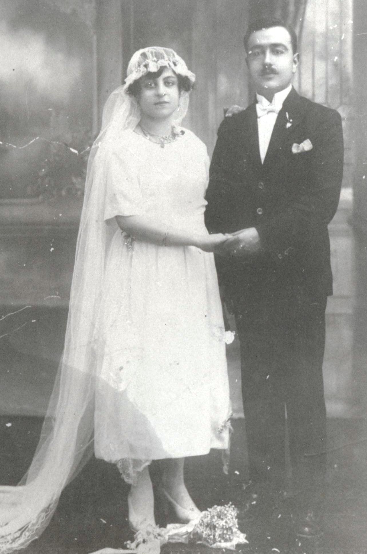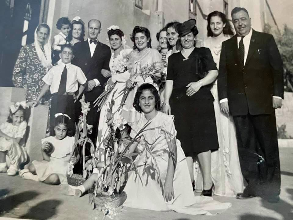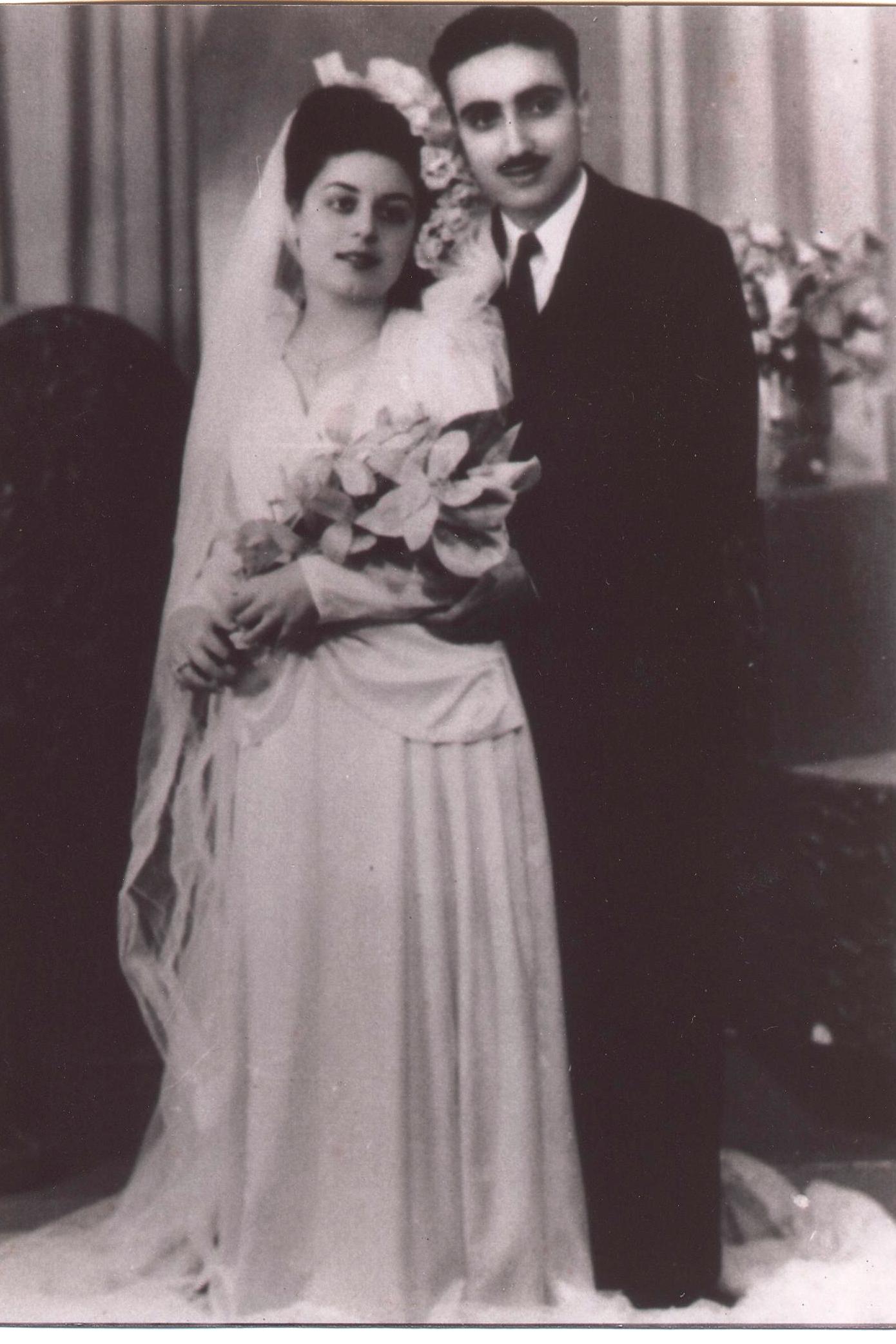 From top left to bottom right: Bahi and Fariid wedding photo; May and Elham as children; the Habiibi family in Egypt after the Nakba; Sami and his niece May in Damascus; May receives a “wedding gift” during the reception; Fariid and brother George with their father Sleiman